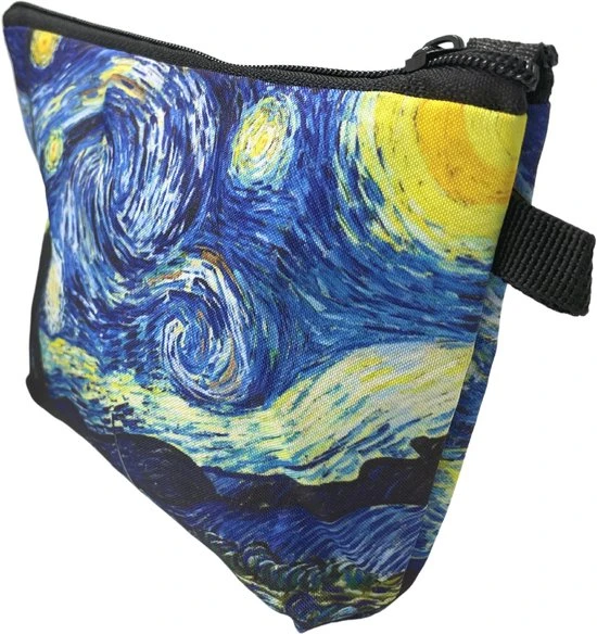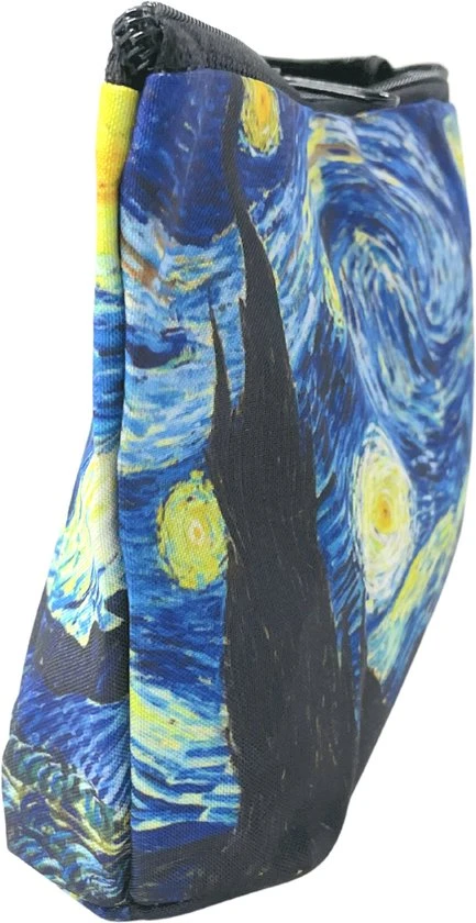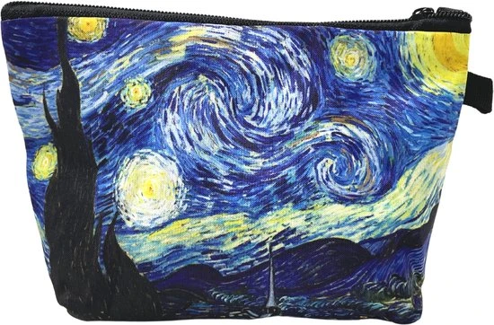 Deze handige Make up Etui is ongetwijfeld je nieuwe favoriet. Het Make up Tasje is Klein van formaat met een afmeting van 21 centimeter breed, 6 centimeter diep en 14 centimeter hoog. Toch is dit mooie make up tasje ontzettend handig, het heeft een zwarte ritssluiting en een opdruk van het beroemde schilderij van Vincent van Gogh: De Sterrennacht. Het tasje is gemaakt uit verstevigd katoen, zo kan het dus eenvoudig tegen vlekken, de binnenzijde is ook van verstevigd katoen en is zwart van kleur. Zo vallen make-up, tandpasta of soortgelijke vlekken niet meteen op. Je kan deze make up etui eenvoudig ergens aan ophangen door het zwarte lusje aan de voorzijde.