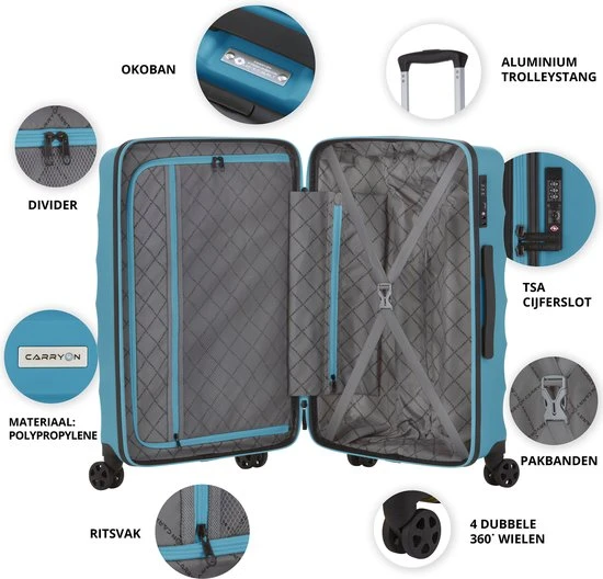 De CarryOn “Porter” is het nieuwe en sportieve model van het Nederlandse merk CarryOn®. Met recht een nieuwe koffer geschikt voor de korte- of wereldreis. Sterk, veilig, betrouwbaar, praktisch en lichtgewicht dankzij het toepassen van de nieuwste technologieën zoals hoogwaardig polypropyleen, aluminium trolleystang, sterke nylon rits, geïntegreerd TSA-cijfercombinatieslot, vier dubbele 360° wielen, het slimme TSA-OKOBAN (een persoonlijke wereldwijde kofferregistratie) en een slim overzichtelijk en praktisch interieur met divider en extra opbergvakjes. Een ideale reisgenoot in vele maten en super sportieve kleuren. Vandaar dat wij op deze serie met een gerust hart 5 jaar garantie kunnen geven.