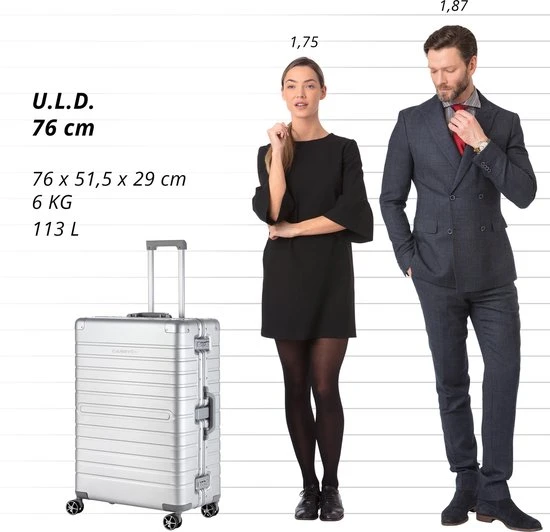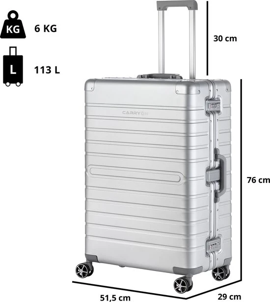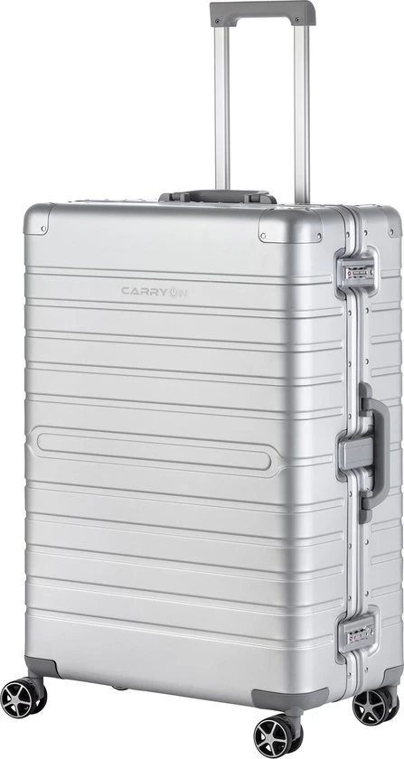 De CarryOn Aluminium reiskoffer is een robuuste, luxe en betrouwbare koffer. Dit model wordt gekenmerkt door enkele noviteiten die uit jarenlange ervaring in de reisbranche zijn terug te vinden in de koffer. De koffer heeft niet één, maar twee TSA-kliksloten en een extra klikslot tussenin, een boven- en zij-handvat, vervaardigd uit 100% aluminium, bezit 4 dubbele geluidlozere wielen, een luxe interieur met uitneembaar organizervak en 2 spanbanden. De verstelbare trolleystang, maakt de kofferserie geschikt voor zowel lange als kleinere personen.