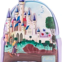 Rugtas Sleeping Beauty Castle Series. Fantastische kunstlederen tas uit de Disney Castle Series-collectie van het Amerikaanse designermerk Loungefly. De voorzijde van de tas is voorzien van een afbeelding van het kasteel van de ouders van Aurora uit de Disney-klassieker Sleeping Beauty. Op de voorgrond loopt Aurora omringd door haar dierenvriendjes uit het bos waar ze haar jeugd doorbracht. Op de achterzijde een afbeelding van Aurora en prins Phillip in hun prachtige galakleding. De tas is voorzien van twee verstelbare schouderbanden en een bijpassende binnenvoering.