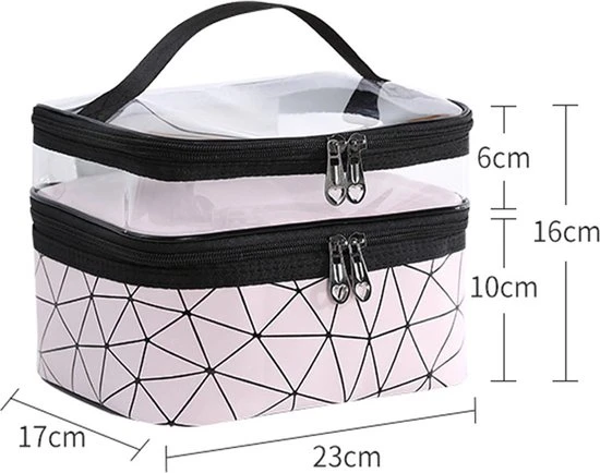 Deze ruime beautycase beschikt over 2 compartimenten met elk een rits. Het onderste compatiment bevat elastische banden waar flesjes achter gestopt kunnen worden. Aan de bovenzijde zit een stevig handvat. De bovenkant is doorzichtig zodat je hier artikelen kunt inleggen die je mag zien. De onderkant is afgesloten.
