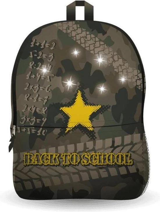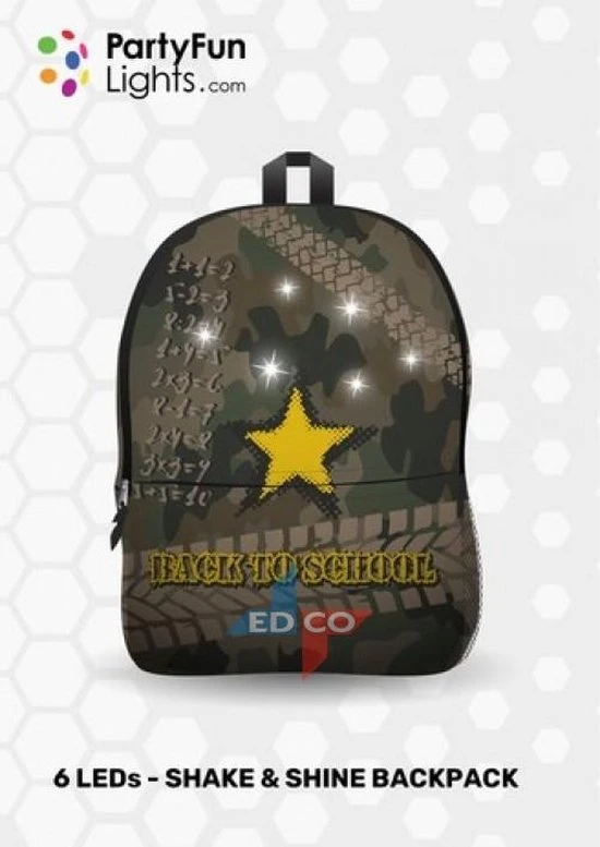 6 stuks White LED’s en Lithium batterij incl. De LED’s beginnen te knipperen gedurende 10 seconden na het schudden en automatisch uitgeschakeld. Kenmerken: 1 x back to school rugtas, Leger print, Polyester: 60 %, EVA: 40 %, Inclusief CR2025 batterij, Afmetingen ong.: 32 x 27 x 10.5 cm, Ritssluitingen, LED activeren ongeveer 20.000 keer.
