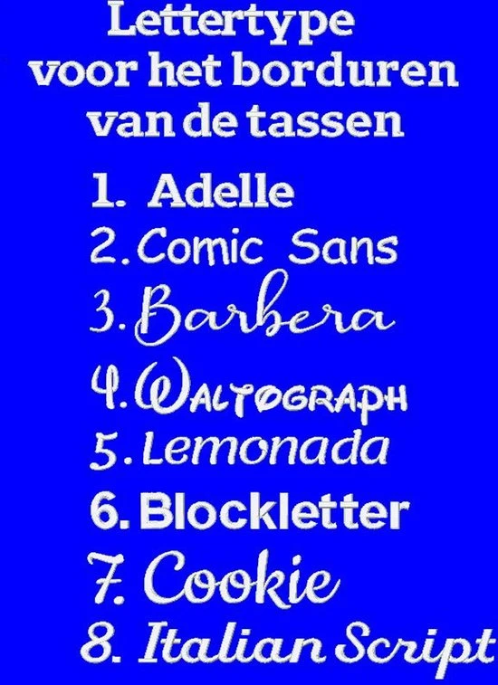* Na uw bestelling sturen wij u een mail uit welke lettertypes en kleuren u kunt kiezen voor het borduren (keuze uit meer dan 500 kleuren.)