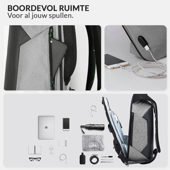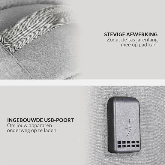 De rugtas beschikt ook over een ingebouwde USB-poort. Hierdoor kan je gemakkelijk je telefoon opladen via een powerbank of laptop. Het voordeel van deze tassen is dat de USB-poort zich aan de buitenkant van de tas bevindt, waardoor je tijdens het laden gewoon gebruik kunt maken van je telefoon.