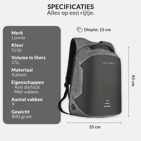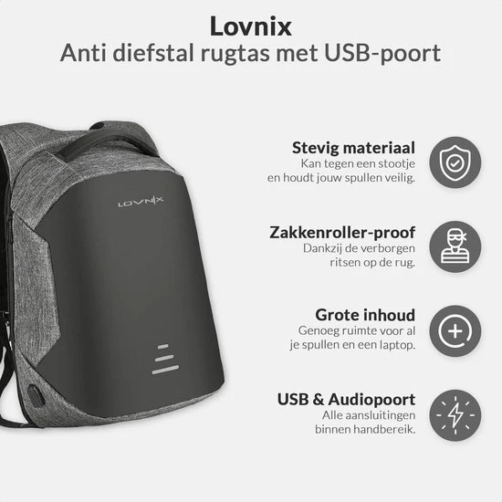 Elke dag bevinden zich wereldwijd veel zakkenrollers. Per dag zijn dit er gemiddeld 400.000. Met de anti-diefstal rugzak van Lovnix zal jij hier geen slachtoffer van worden. Het materiaal van deze tas is namelijk erg stevig, dus niet makkelijk op te snijden. Niet alleen is dit een voordeel, maar een andere eigenschap van deze tas is dat de ritssluiting op je rug zit. Dus mocht de tas open gemaakt willen worden, zul je dit ten alle tijd voelen. Verder heeft de rugzak reflecterende details, waardoor je goed zichtbaar bent in het donker. De tas is waterafstotend en heeft aan de buitenzijde een USB- en audioaansluiting. Ook heeft de rugzak aan de binnenzijde vele vakken en een apart vak voor een laptop of tablet van 15,6 inch.
