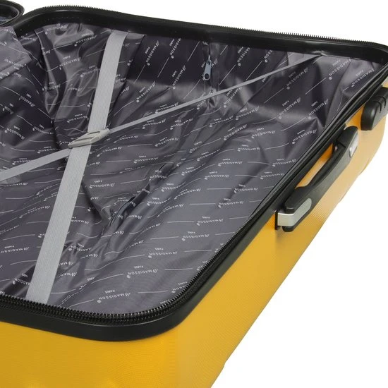Deze betrouwbare koffer beschikt over al het nodigde voor u volgende vakantie. Een harde en veilige buitenkant, een aliminium trekstang, 3-cijferige slot, 4 dubbele flexibele wielen. De koffer is verkrijgbaar in 3 formaten. De middenmaat en grote maat zijn voorzien van stootrubbers, deze zorgen ervoor dat uw koffer tijdens transport zo min mogelijk beschadigd raakt. De stootrubbers bevinden zijn aan de lange zijde van de koffer. Zo beschikken de middenmaat en de grote maat ook voor een extra handvat. Deze zit onder het cijferslot. Doormiddel van deze extra handvat is het makkelijker om de zware koffer te verplaatsen of op te tillen in de auto, trein of bus. Binnen in de koffer is er een duidelijke en overzichtelijke verdeling. Aan de ene zijde een divider met 2 gekruiste spanbanden en aan de andere zijde een handige ritsvak. Dit maakt deze koffer van het merk Madison een betrouwbare reispartner met een fraaie design.