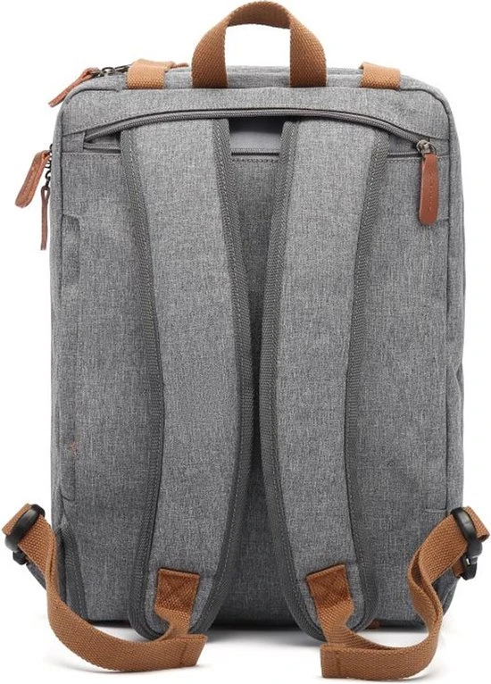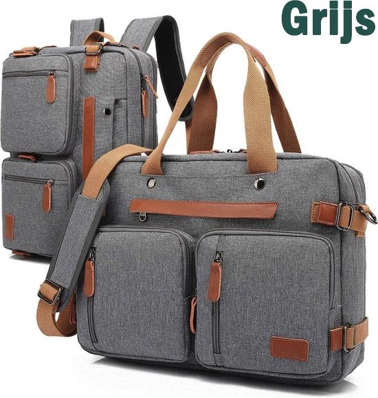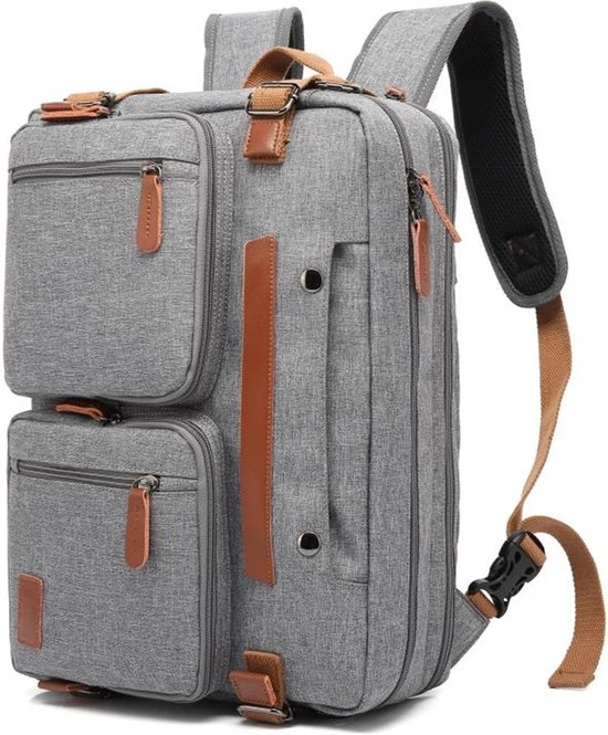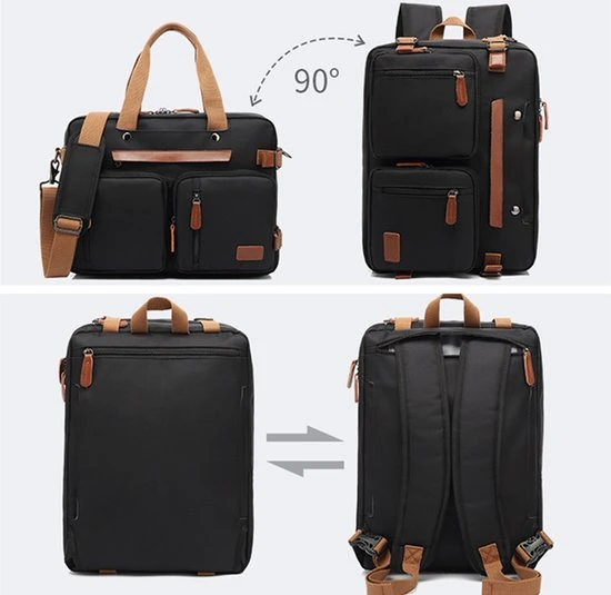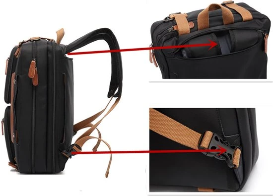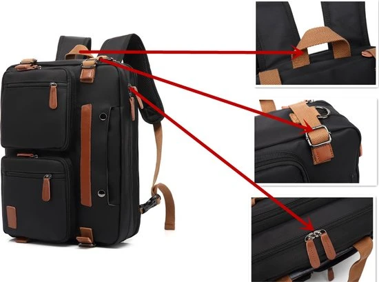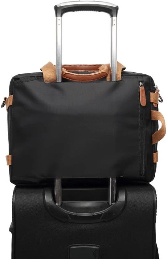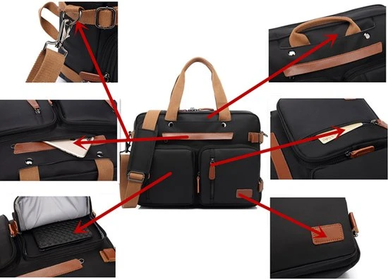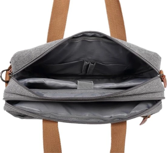 Interne structuur van de tas: computervak, gsm-vak, gelamineerd ritsvak, dossiervak, cameratasje, ritsvak
