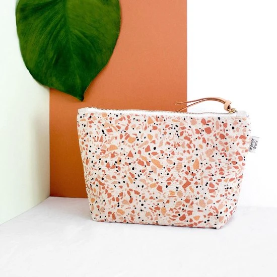 Deze make-up tas is gemaakt van sterk katoenen canvas en is groot genoeg om al uw make-up en cosmetische accessoires gemakkelijk mee te nemen. De toilettas vertoont een kleurrijk trendy terrazzo patroon in een oranje terracotta kleurenpalet, met zwarte stippen. De tas heeft een driehoekige vorm zodat hij rechtop kan staan om gemakkelijk al uw make-up of andere cosmetische artikelen te vinden.