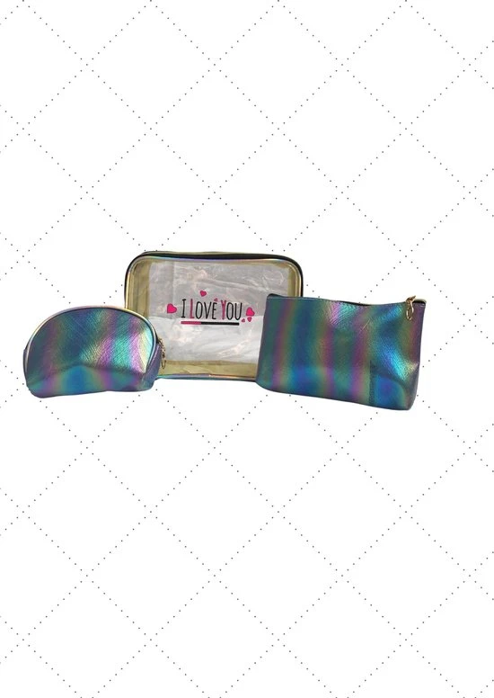 Een set van 3 toilettassen. De 3 verschillende formaten zijn allemaal afsluitbaar met een rits en handig voor toiletartikelen en cosmetica. Het grootste formaat beschikt over een handvat. Met deze 3 delige set heeft u altijd de juiste toilettas bij de hand.
