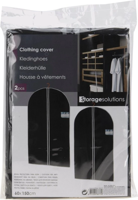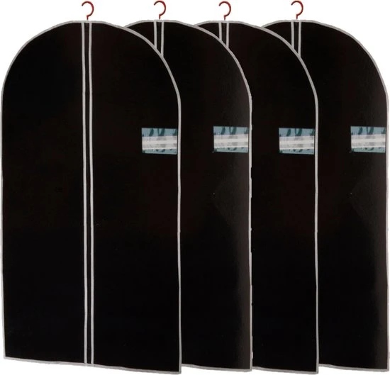Set van 4x stuks zwarte kledinghoezen. Zwarte beschermhoezen om uw kleding stofvrij op de bergen of op een nette manier te vervoeren. De hoezen zijn voorzien van een volledige ritssluiting en een kijkvenster. Materiaal: 95% nylon, 5% polyester. Formaat: ca. 60 x 150 cm.