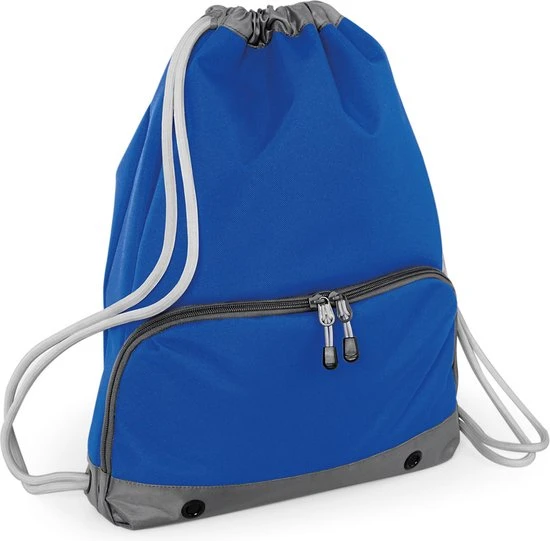 Sport gymtas blauw met rijgkoord 49 x 35 cm van polyester met ruim hoofdvak, dikke stevige aanrijgkoordjes, metalen verluchtingsgaatjes, apart schoenenvak, waterdichte stof, flessenhouder. Inhoud: 18 liter.