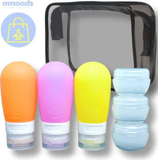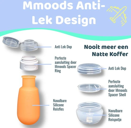 De set is ideaal voor een weekendtrip of langere reis. Neem je favoriete producten me in je handbagage. Geen gesleur meer met grote flessen of potten die veel plaats innemen. De set is uitgerust met aanduidingen van inhoud, dus ook langs de douane kom je er met deze set vlotjes door. Dankzij het Mmoods Anti-Lek Design hoef je je ook geen zorgen te maken over het uitlopen van je producten.
