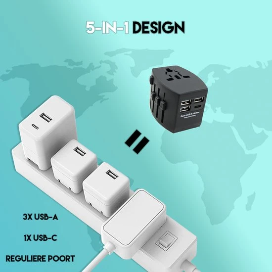 Het mooie compacte en stevige design zorgt dat deze stekker fijn in de hand ligt en makkelijk in het stopcontact plugt. Door de vele ingangen (3 USB-A, 1 USB-C & een reguliere ingang) van deze stekker kun je gemakkelijk tot wel 5 apparaten tegelijk opladen en gebruiken. Door de verschillende uitschuifbare opzetstukken is de stekker te gebruiken in meer dan 150 landen over de hele wereld, en met de mooie opberghoes kun je de stekker gemakkelijk en veilig meenemen in je bagage.