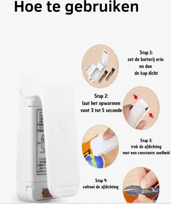 - 1. Installeer 2 AA-batterijen in de bag sealer. (plaats de batterij, deze wordt niet heet)