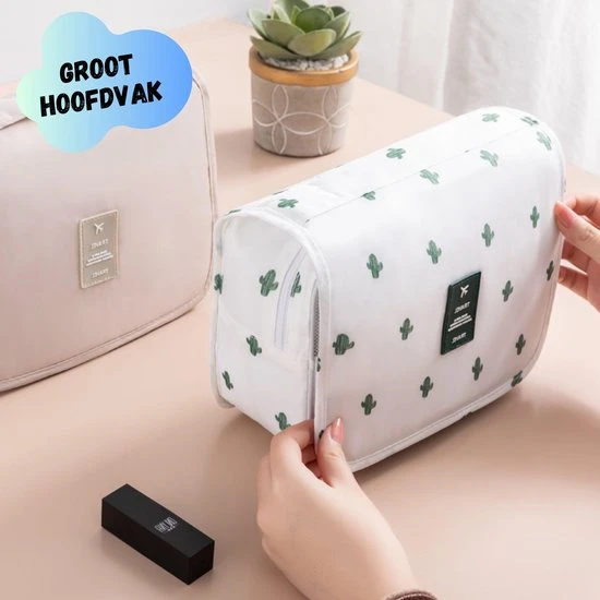 De Reismonkey Ophangbare Toilettas met Cactus Print biedt veel ruimte door de verschillende vakken.