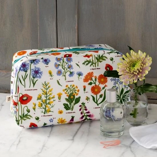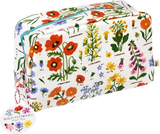 Mooie, stevige en ruimte toilettas met een bloemenprint. De toilettas is van het Engelse merk Rex London. De toilettas is gemaakt van tafelzeil en is vuil- en waterafstotend. Aan de binnenkant bevindt zich één groot vak en een apart binnenvakje.