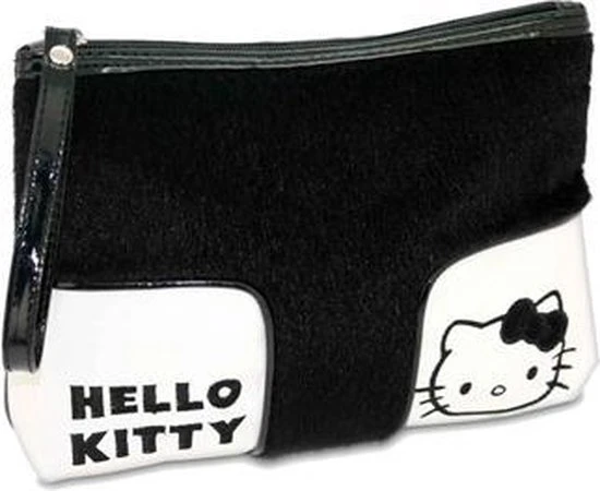 Stoer toilettasje van Hello Kitty. Aan de voorzijde een zwart vlak (harig) met 2 witte vlakken (leder look), de achterzijde is geheel zwart (leder look).