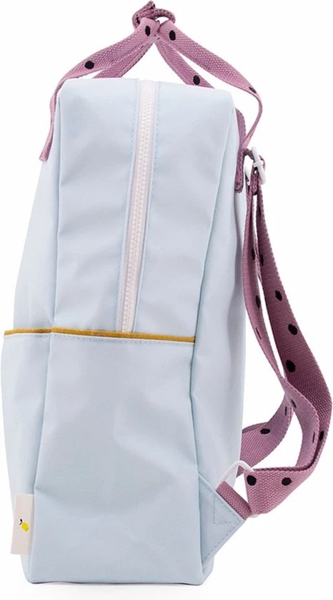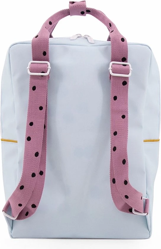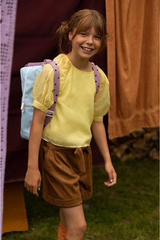 A sky blue + pirate purple + caramel fudge large backpack. On the front you find an extra pocket. It has adjustable shoulder handles. The body is made from recycled PET bottles, the lining has a freckles pattern and is waterproof. The zipper is from YKK. On the inside you’ll find an elastic bottle holder and a pocket all over the back that closes with velcro. size – 27 x 13 x 38 cm maximum length shoulderhandle – 67 cm material outside – recycled PET bottles material inside – waterproof nylon – You can easily clean this bag with a wet cloth. We advise you not to wash the bag in the washing machine. Just some water will do the trick!