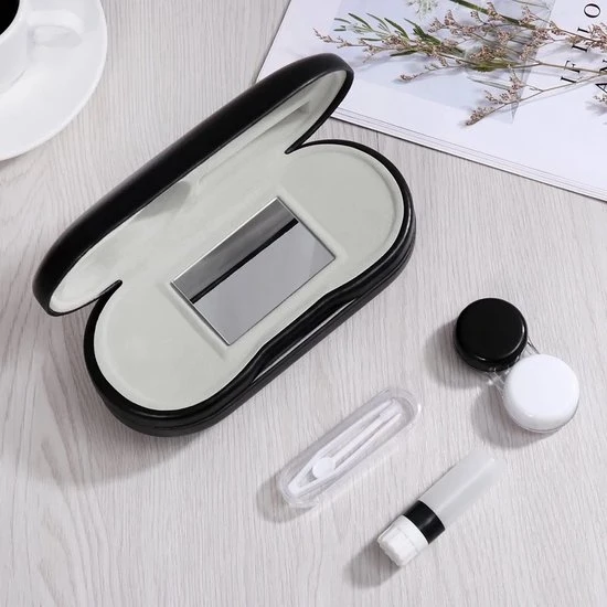Inhoud: ingebebouwde spiegel, lenzenbakje, vloeibaar flesje, pincet & applicator.