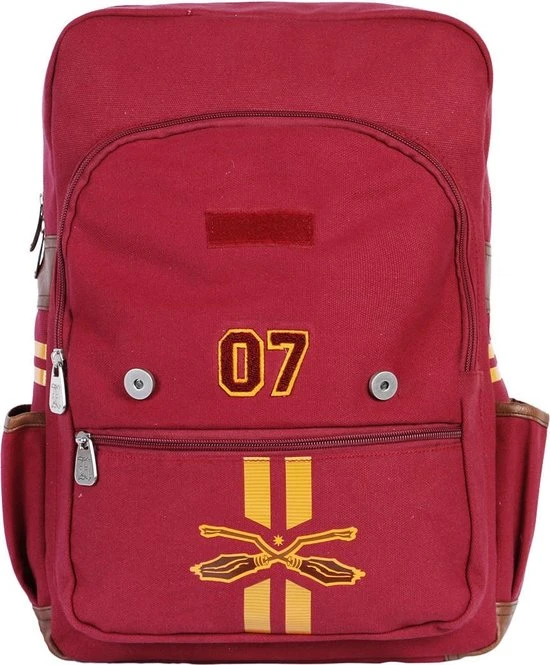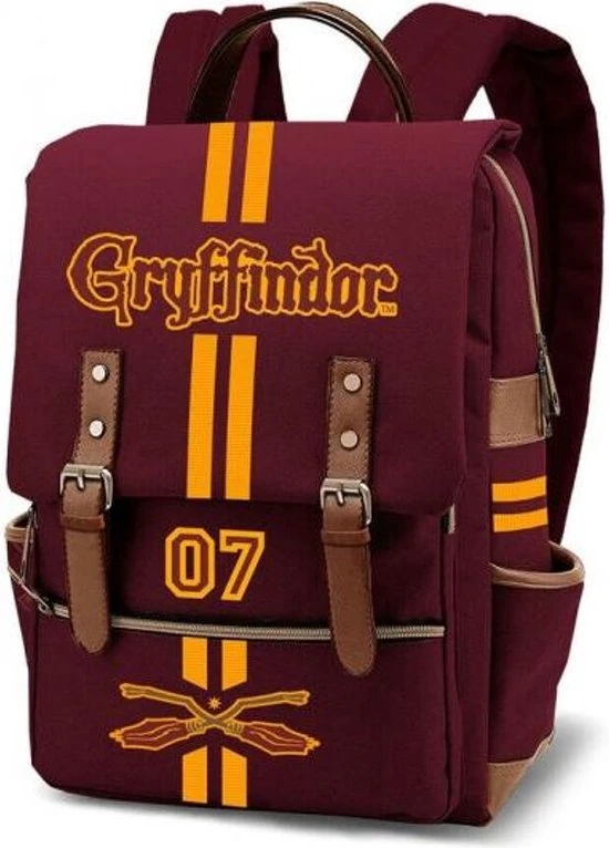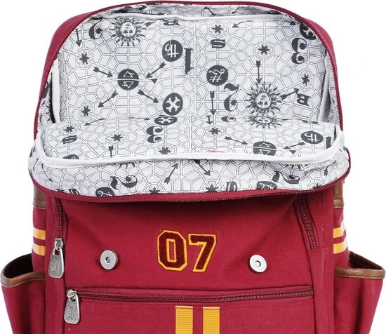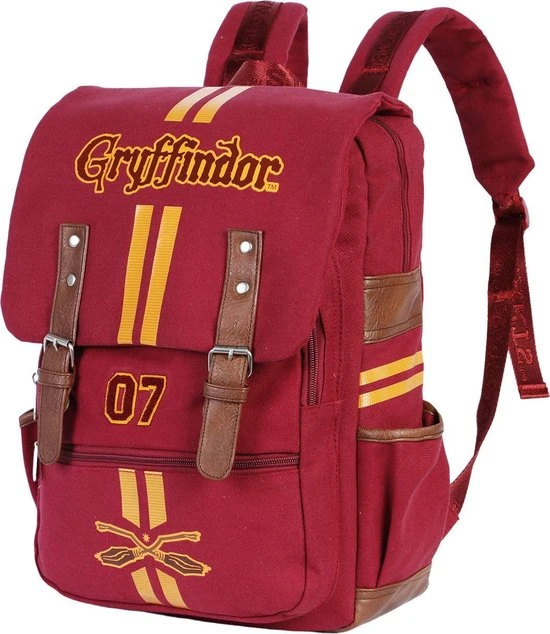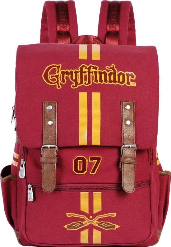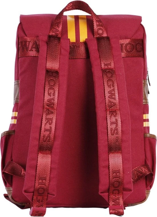 Op de rugzak vind je de tekst Gryffindor en andere symbolieken.