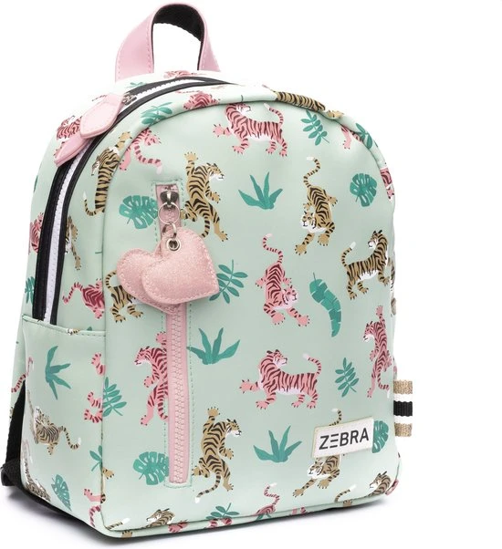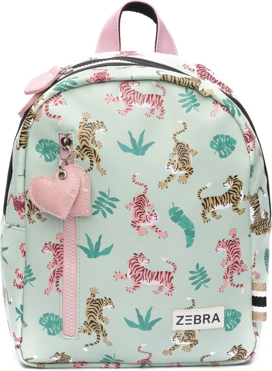 Een mintgroene PU kwaliteit met stoere tijgers rugzak van Zebra. De rugzak heeft voorop een verticale roze rits afgewerkt met hartjes, die dient als extra opbergvak. De gehele rugzak heeft een stevige zwart-witte blokrits met dubbele sluiting. De tas is te dragen dmv het korte hengsel bovenop en de verstelbare schouderbanden. Binnenin bevinden zich 2 drinkbekervakken en een vrolijke lichtroze gestreepte voering. Achterop het handige naamlabel.